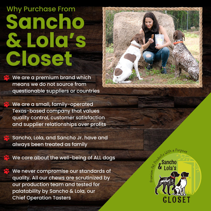 Safety information from the Founder of Sancho & Lola's Closet, Lynette Cano "All of our chews are 100% natural and digestible. They will never contain any rawhide. Thus, the main concern when a pup swallows any of our chews like bully sticks, tendons, or ears, would be if it blocks his airway. This can also happen with a piece of jerky, a baby carrot, a squeaker from a toy, or any object they find on the floor. So, we recommend monitoring your pup when you notice they are chewing on anything. One of my dogs has a bad habit of counter-surfing and stealing wine corks, pens, mouthguards, etc. He gets monitored a lot more closely than the others. If a piece of bully or tendon becomes an obstruction, it will be very noticeable that he/she is having trouble breathing. This is when you want to take him to your veterinarian immediately. Some dogs, like Sancho, get a gag reflex if they swallow a chew. It gets thrown up immediately. Other dogs, it goes out the other end and may cause their stool to be loose or even runny. Runny stools are no cause for concern unless accompanied by G.I. discomfort. This is rare but can happen to a dog with a sensitive tummy. Therefore, if your pup swallows a chew and there are no obvious signs of obstruction, you may still want to monitor them over the next 24 hours. Call your vet if your dog refuses to eat or has trouble defecating. * Loose stools from bully sticks and tendons are common for dogs that eat the same food every day. Especially bully sticks since they are high in protein. Old-school veterinarians advise feeding your dog the same food. Holistic vets and nutritionists recommend rotating kibble flavors to mix things up. My favorite proteins to rotate are salmon, turkey, kangaroo, bison, and venison. Since my dogs are part of SNL’s quality control / new product development team, I top off their kibble with a generous tablespoon of canned pumpkin mixed with chia seeds. Both are known to firm up a dog’s stool." Mine do not have any GI issues with any of our chews other than yak sticks. Lola who is 14 years old has zero issues. The other 3 all barf up a piece of yak stick the next morning if they consume a chunk. Thus, I only feed them yak sticks when I receive samples from a new supplier we are considering.